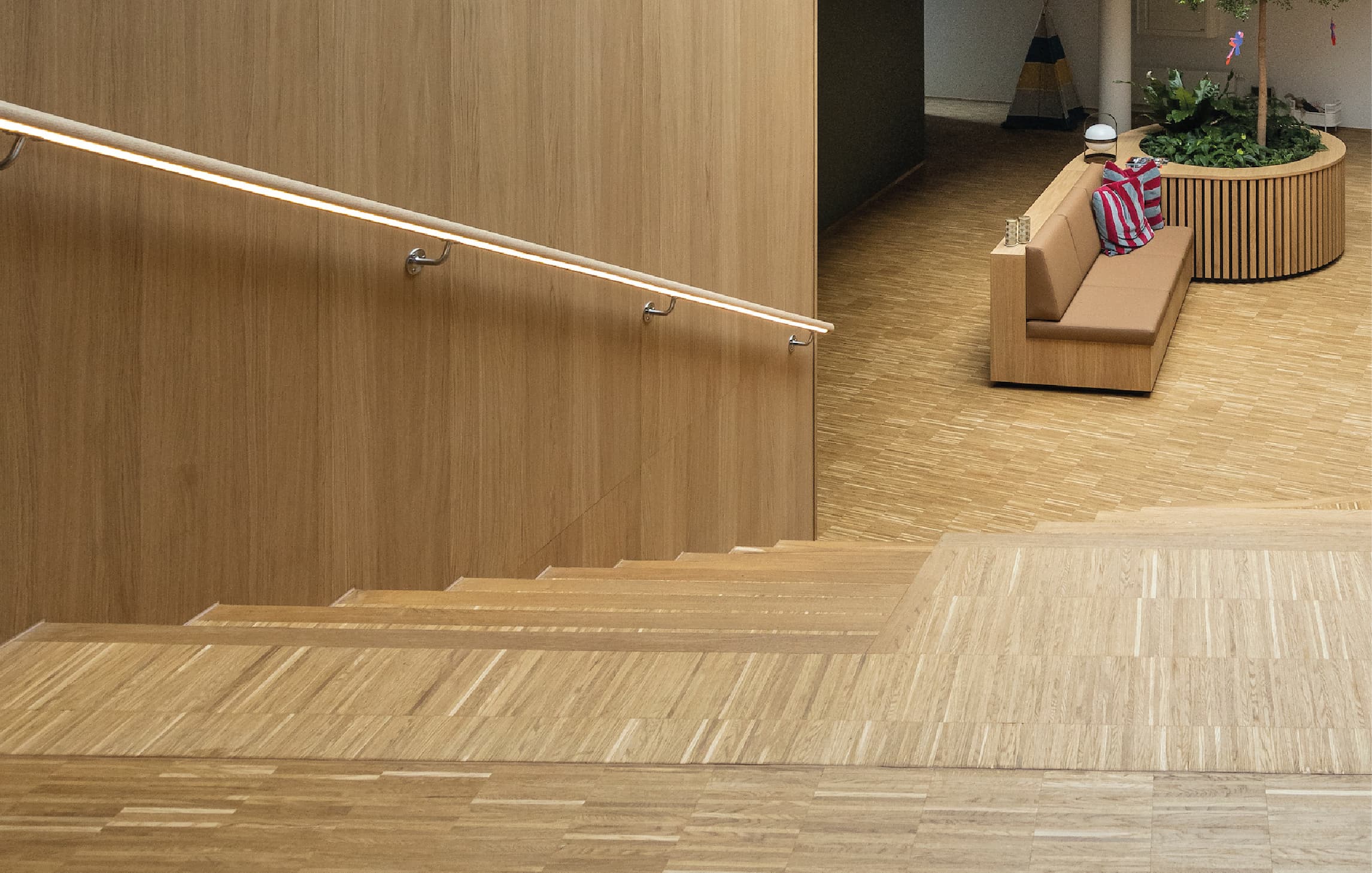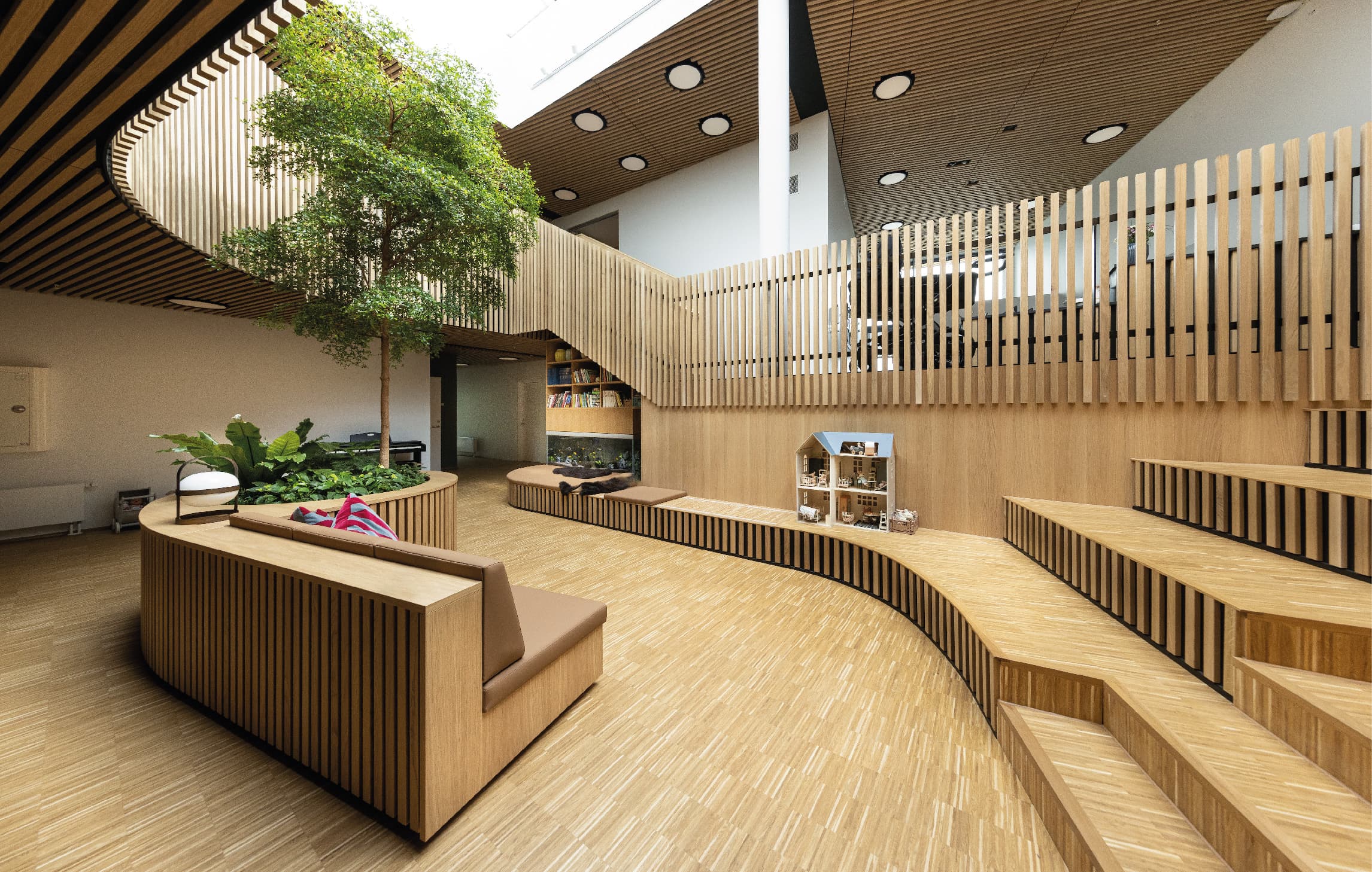 The predominant material in Strandbakkehuset is oak wood, and it has been crucial for the place's soothing character and the experience of a non-institutional environment. The use of oak wood in Strandbakkehuset has also created an organic expression and a better connection between the exterior and the interior.