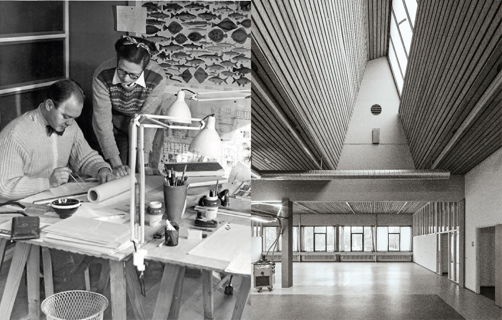 DTU Building 208, constructed in 1967 with traditional auditoriums and laboratory facilities, is one of the seven original functionalist specialty buildings on the Lyngby Campus, designed by architects Eva and Nils Koppel. Despite being built with high standards in architecture and learning, extensive rebuilding and modernisation were necessary.