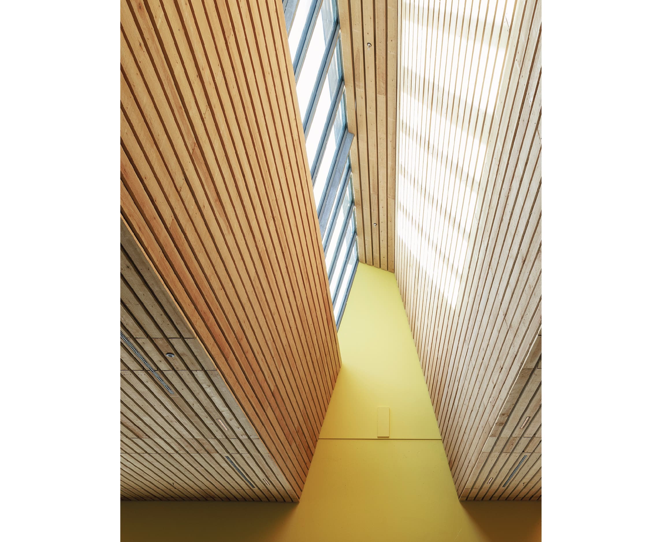 Daylight now floods the entire building, enhancing the transformed study environment. Window sections have been expanded, and skylights added to open the previously dark building. Common areas have been strategically relocated along the facade's many window sections. This has created a more vibrant and connected environment, allowing students and staff to navigate easily and stay connected with the landscape outside.