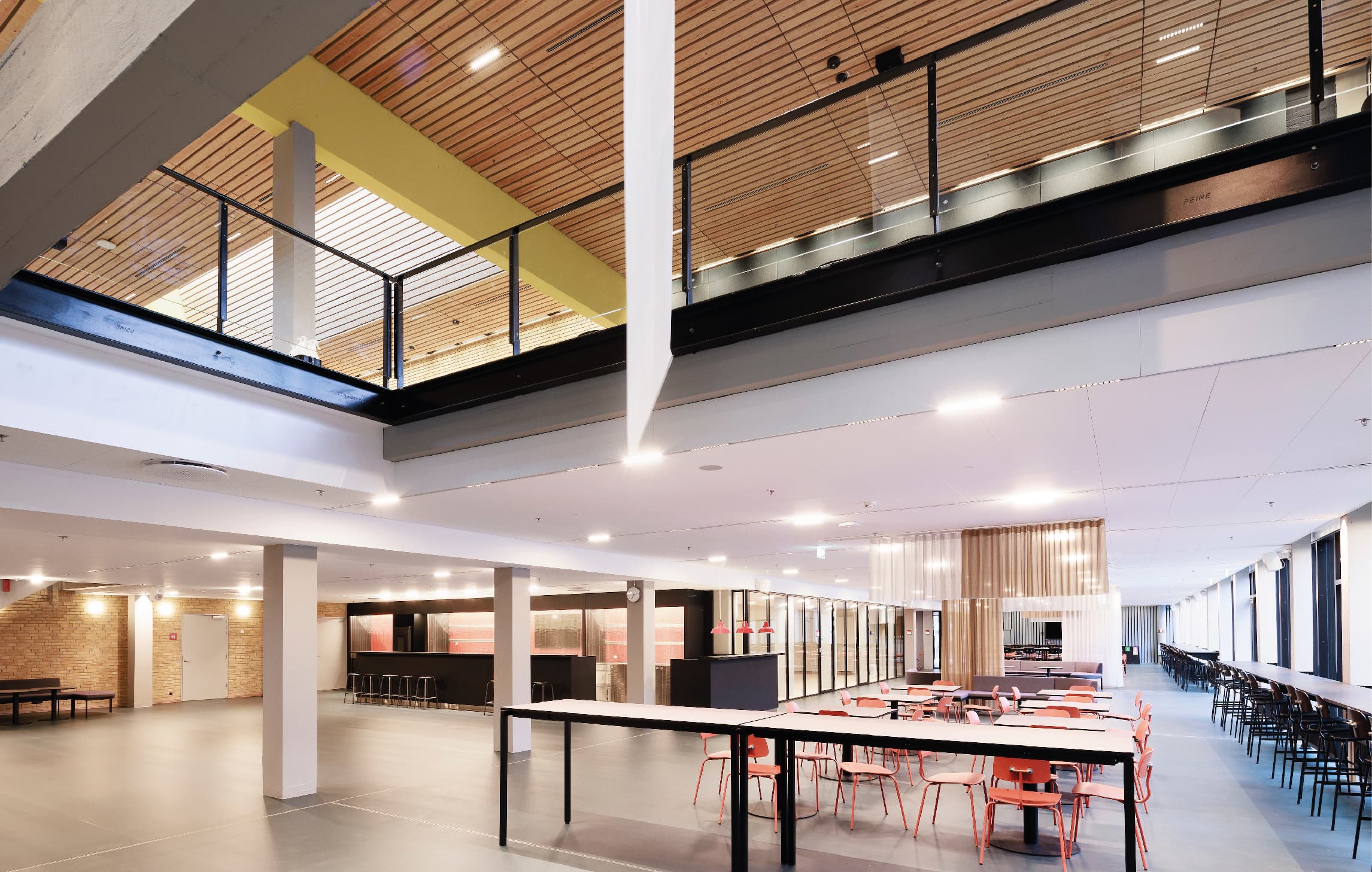 With a focus on creating an inclusive space where both students and lecturers feel welcome, the entire ground floor of the building has been dedicated to a common area divided into different zones including a Friday bar, lounge area, and dance floor, while students on the first floor can gather and immerse themselves in both formal and informal learning environments.