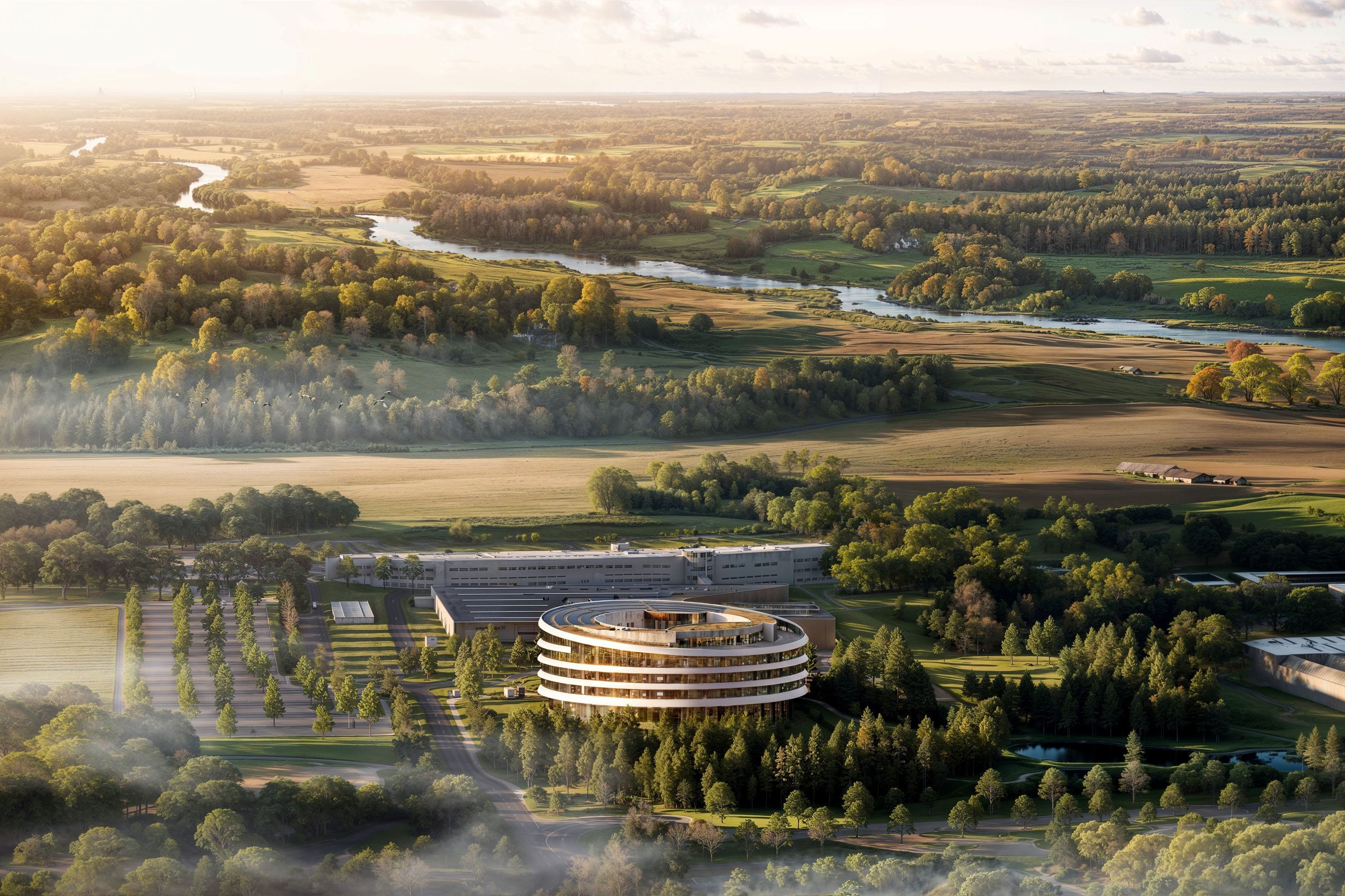 Midt i det smukke landskab vil en ikonisk, rund træbygning rejse sig – et nyt vartegn for Grundfos, og en fysisk manifestation af virksomhedens værdier og ambitioner; forankret i Bjerringbro og Grundfos’ historie og fremadskuende i sin arkitektoniske, landskabelige og bæredygtige strategi.