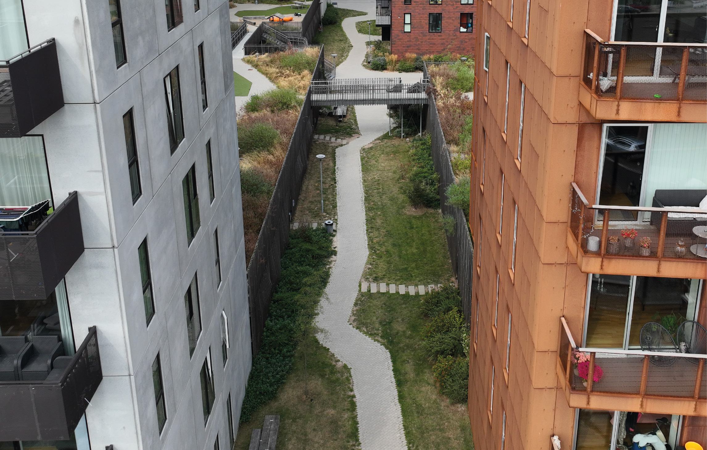 En åben boligkarré kendetegnet ved sit unikke og landskabelige gårdmiljø