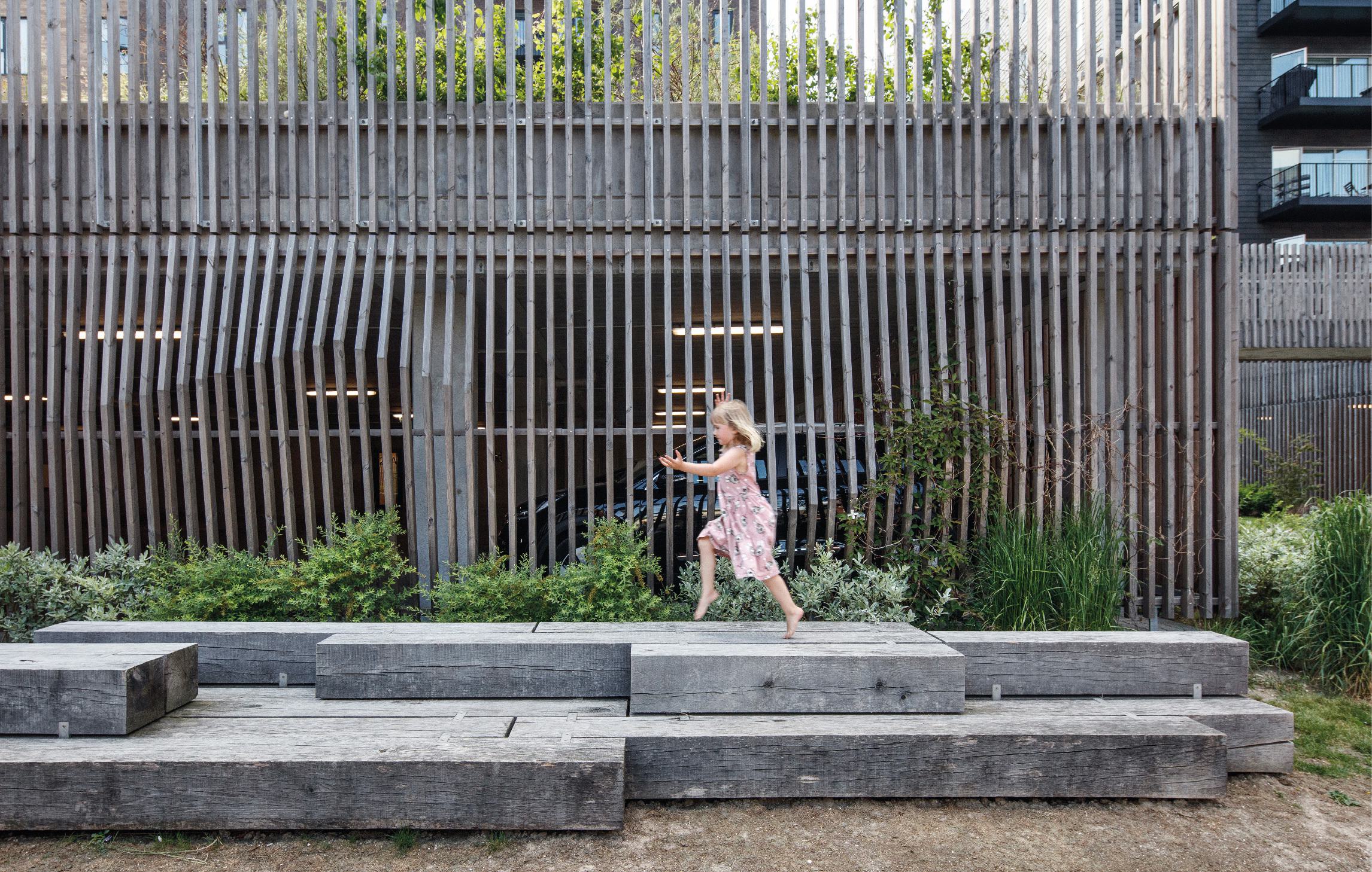 Den Grønne Fatnings separate bebyggelser er alle opført med både variation i skala og facadeudtryk – alt sammen nøje afstemt for at give det samlede boligområde et tæt og urbant udtryk. Et gennemgående materiale, der binder de mange forskelligartede bygninger sammen, er således anvendelsen af træ i de fælles ude- og gårdarealer. Her går brugen af trælameller igen i både afskærmningen af parkeringsanlægget, i gangbroerne og i trappeforløbet, hvor de bløder op og bidrager til et både æstetisk smukt, stofligt og imødekommende arkitektonisk udtryk.
