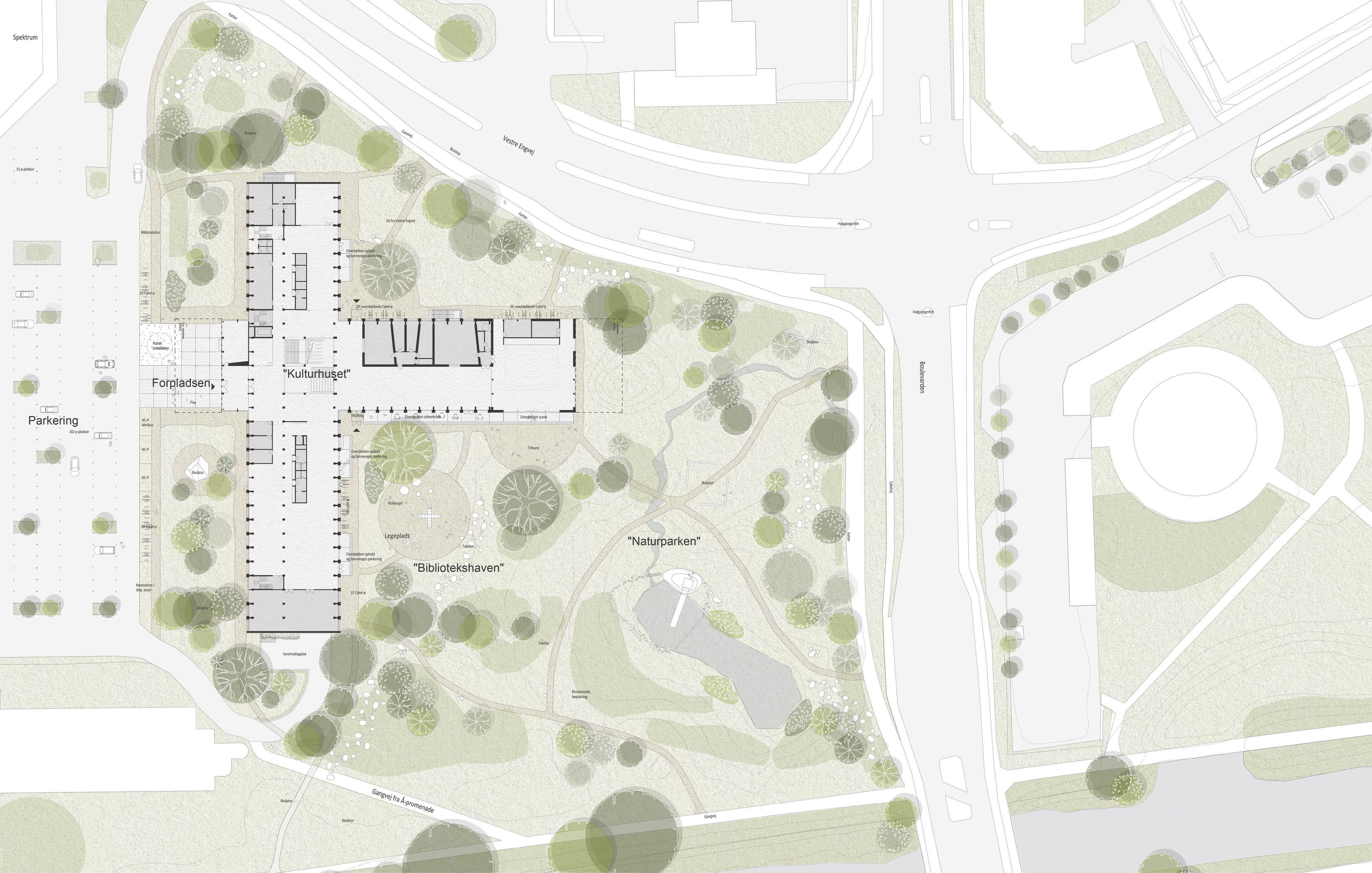 Kulturhusets udearealer bliver udformet med både brugsværdi og naturlig skønhed for øje, og som besøgende vil man opleve en materialemæssig sammenhæng mellem ude og inde.